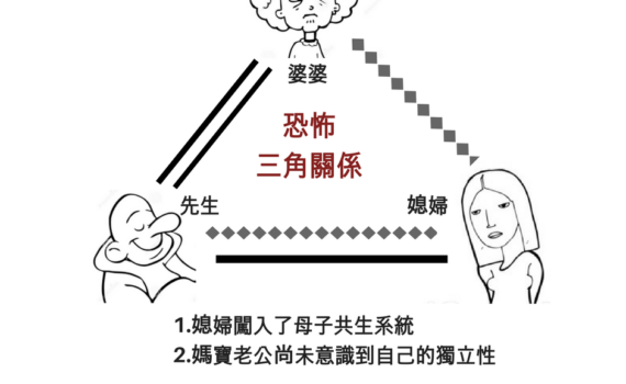 我說:「這樣太容易聚焦成女人的戰爭了,其實這如果回到『心理界限』上,其實就是男生與母親的情緒界限要清楚,並且可以開始保護自己的夫妻關係,而不是一直處在先生、太太、婆婆的恐怖三角關係中。」