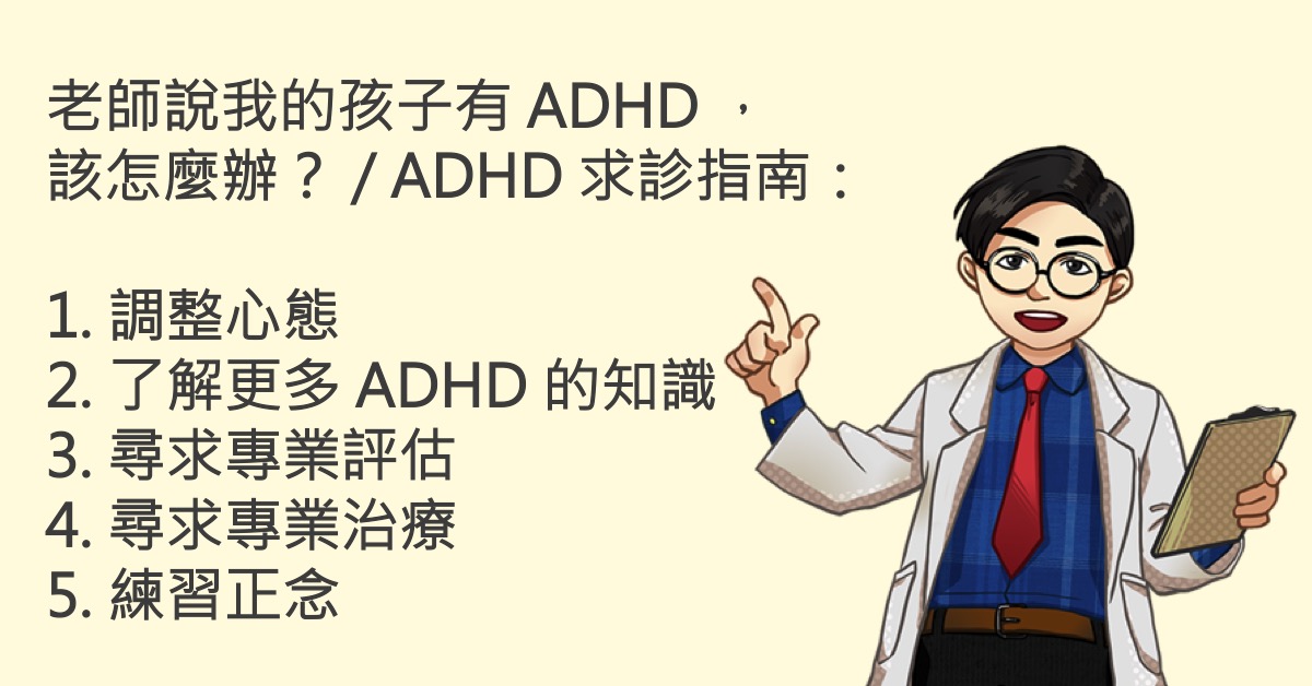 當家長聽到老師或是親友這樣關切孩子時,通常都會反覆經過這樣的心路歷程:「否認」(例如:大寶才沒有不專心或過動,他很棒)、「憤怒」(例如:是老師教不好!怎麼怪到我的孩子頭上)、「討價還價」(例如:是不是我沒有嚴格管教,就不會靜不下來)、「憂鬱」、「接受」。