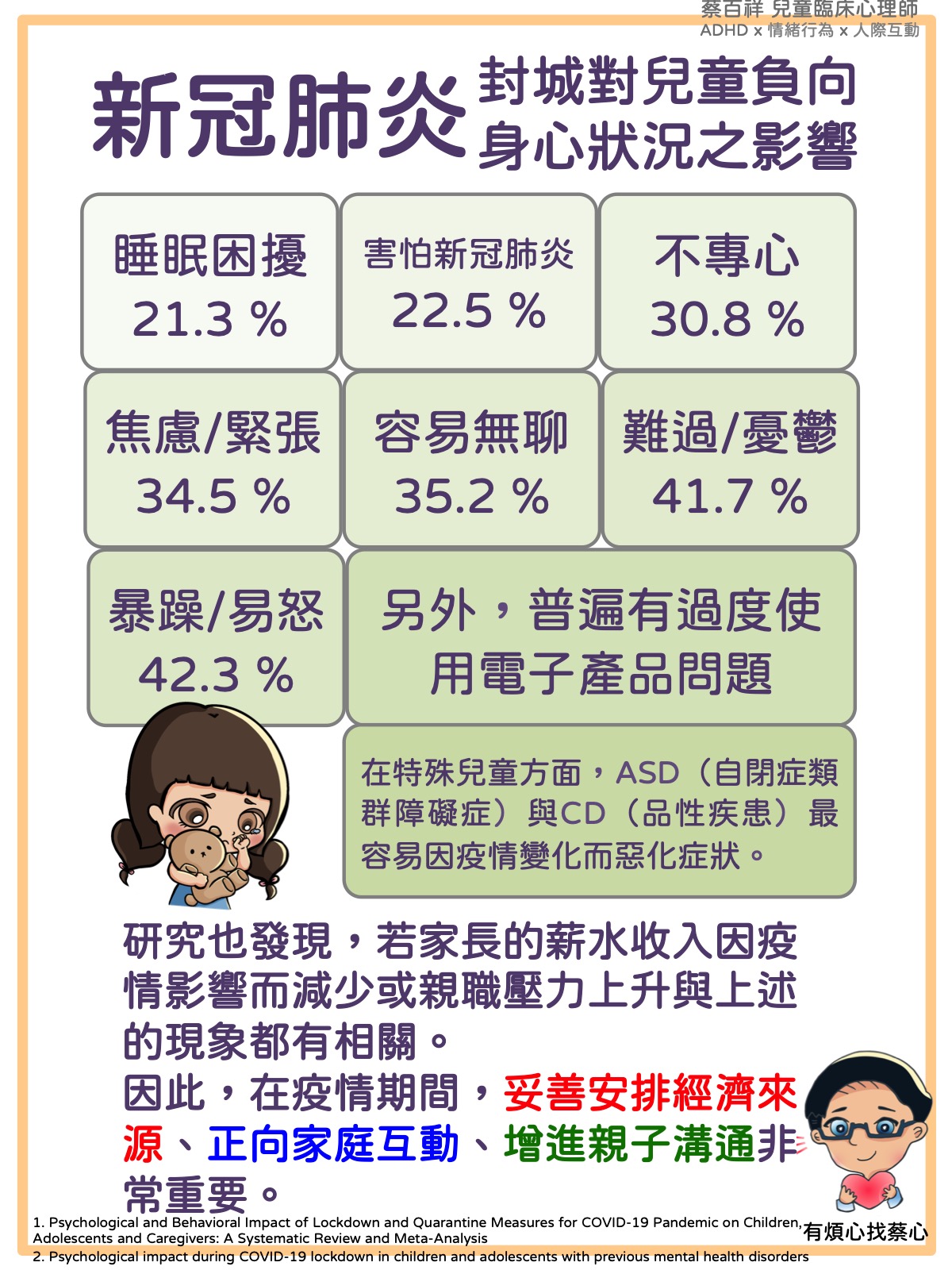 最近疫情變嚴重了,我很想知道如果封城(lockdown)了的話,對兒童身心健康會不會有影響。因此我就查了一些文獻,結果我發現國外有不少這樣的研究。雖然國外研究的結果不能直接推論台灣的狀況,但應該有參考價值,所以我就做成了圖文與百香果分享。