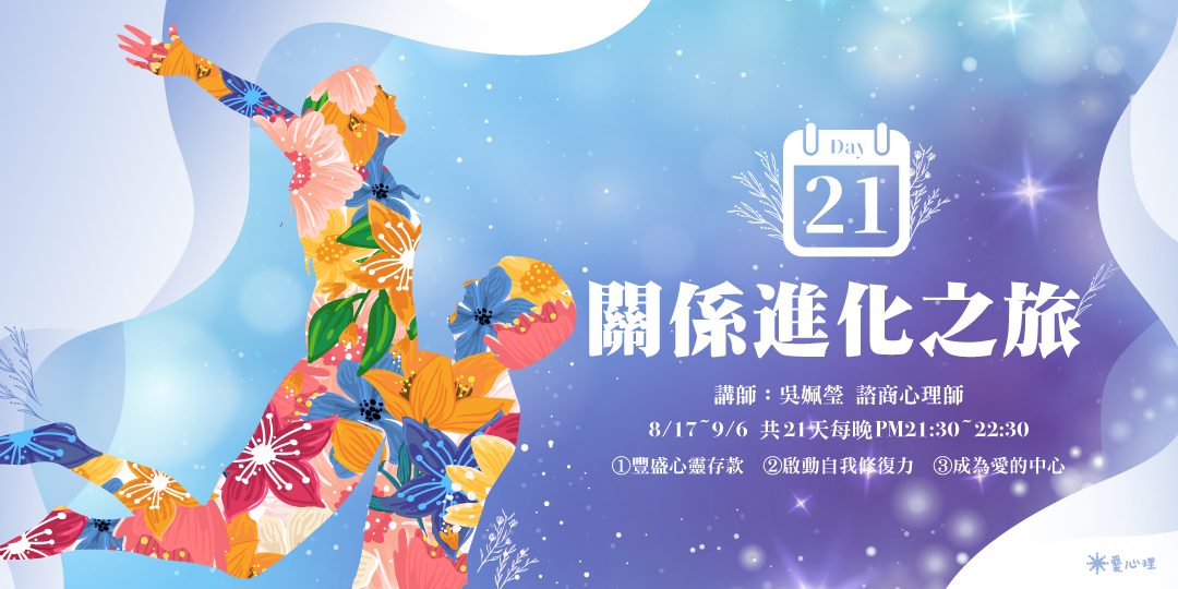 在21天關係進化之旅中,我們陪你一起鍛鍊關係的心智、培養內在穩定度,準備好豐盛的自己,充滿盛開綻放的吸引力與自信力,進而擁抱自己擁抱愛。